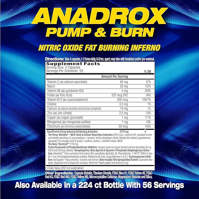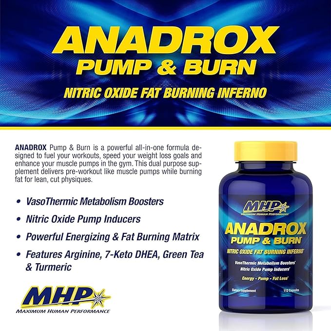 Mhp Anadrox Pump & Burn es un quemador de grasa diseñado para acelerar el metabolismo y promover la pérdida de peso. Contiene ingredientes termogénicos de origen natural. Presentación: 112 CAPSULAS.