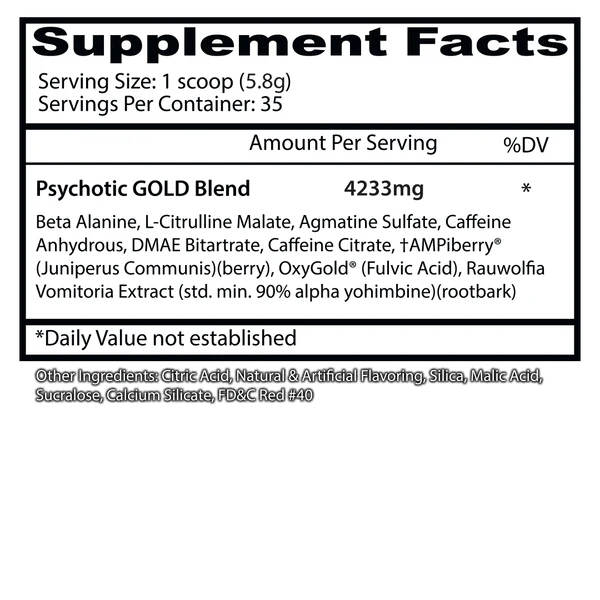 Psychotic Gold es un pre-entrenamiento completo que ofrece una energía similar a la del original, con la adición de potenciadores vasculares que inundan tus músculos con el oxígeno que necesitan para rendir al máximo.