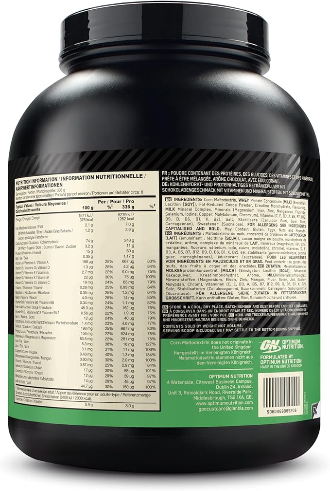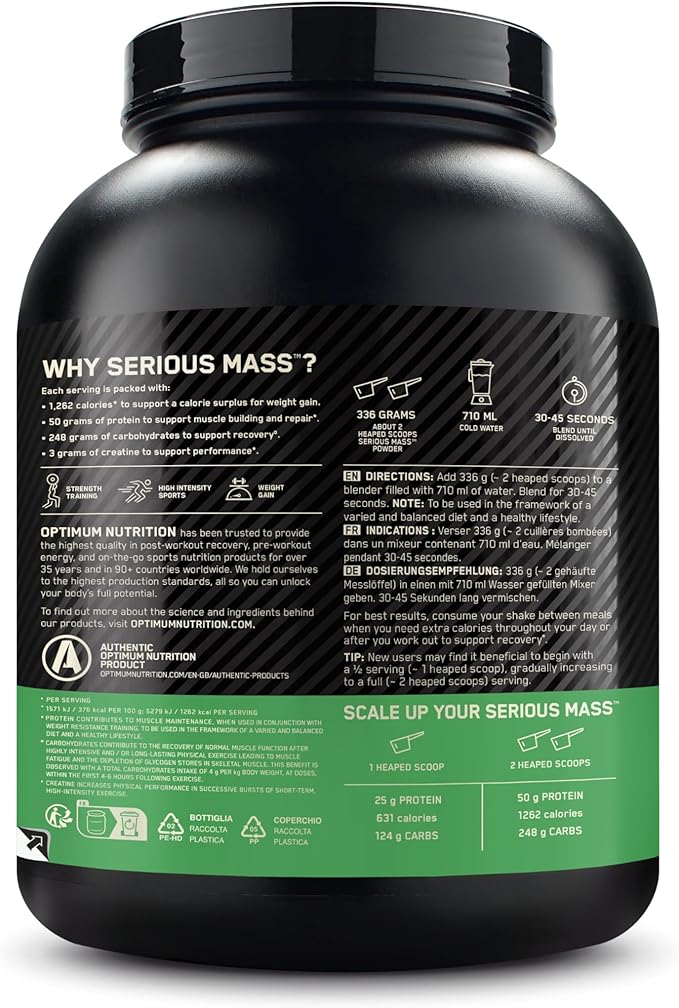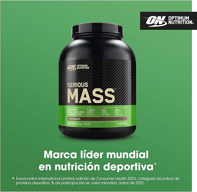 Optimum Nutrition Serious Mass 12LB es el ganador de peso más vendido del mundo, diseñado para ectomorfos que necesitan ganancia masiva. Con 12 libras, este es el formato gigante que proporciona suministro para months de uso diario. Cada servicio contiene aproximadamente 1250 calorías con 50g de proteína multi-componente de alta calidad. 1250 calorías por servicio significa que puedes consumir una comida completa en un batido, ayudándote a alcanzar tus objetivos calóricos sin tener que comer constantemente. Con 50g de proteína, obtienes aminoácidos suficientes para síntesis de proteína muscular óptima. Gana volumen masivo porque Serious Mass fue diseñado específicamente para atletas que tienen dificultad ganando peso. Los carbohidratos complejos proporcionan energía sostenida y reponen glucógeno muscular. La proteína multi-componente asegura que tus músculos reciban aminoácidos tanto rápidos (whey) como lentos (caseína). Formato gigante económico porque comprando en grande ahorras dinero significativamente por servicio. Con 12 libras, tienes más de 800 gramos de proteína en total. Ideal para ectomorfos que necesitan 4000+ calorías diarias. Los sabores son deliciosos, haciendo que sea fácil consumir calorías masivas. Calidad ON verificada. Importado desde USA. Ganancia masiva en formato masivo.