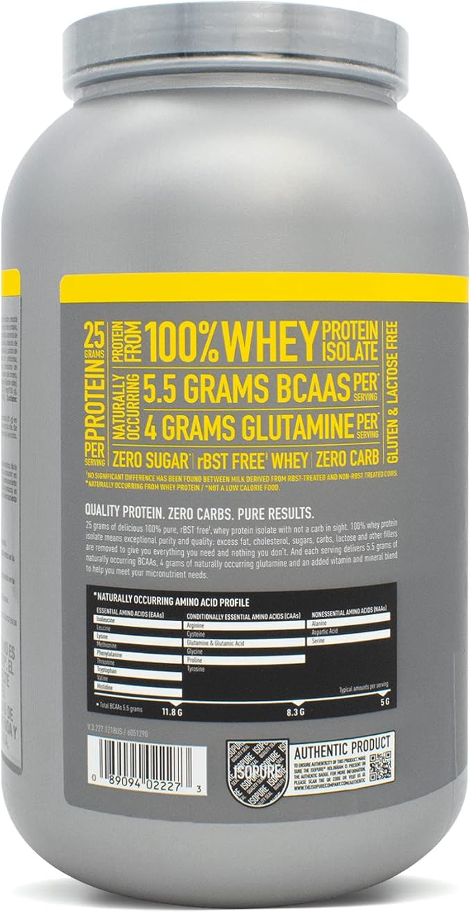 Natures Best Isopure es whey protein isolate 100% puro en formato de 3 libras. Cada servicio proporciona 25g de proteína isolate ultra-pura con cero azúcar y cero carbohidratos. Isopure utiliza tecnología de microfiltración avanzada para eliminar prácticamente toda la lactosa, grasas y carbohidratos, dejando solo proteína whey pura con máxima biodisponibilidad. El whey isolate es la forma más pura de proteína disponible – ideal para definición extrema porque proporciona proteína pura sin calorías extras. También es perfecta para personas intolerantes a lactosa porque el proceso de filtrado elimina más del 99% de lactosa. La absorción es ultra-rápida post-entrenamiento para iniciar la síntesis de proteína muscular inmediatamente. Los sabores son naturales y deliciosos. Con 3 libras, tienes suministro para semanas de entrenamiento intenso. Recuperación rápida sin calorías extras. La pureza es máxima – cada gramo es proteína de la más alta calidad. Ideal para atletas en fase de definición que quieren máxima proteína con mínimas calorías. También perfecta para personas con problemas de digestión. Sin rellenos ni aditivos innecesarios. Calidad verificada constantemente. Importado desde USA. Pureza que se siente en cada batido.